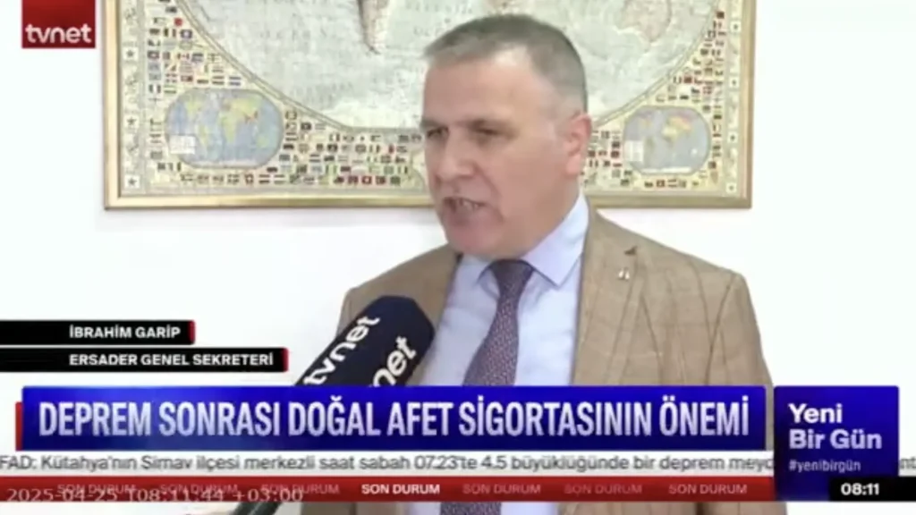 ERSADER (Erdemli Sigorta Aracıları Derneği) Genel Sekreteri Sn. İbrahim GARİP, TVNET kanalında katıldığı programda “Deprem Sonrası Doğal Afet Sigortası’nın Önemi” üzerine dikkat çeken açıklamalarda bulundu. Türkiye’nin doğal afet riski yüksek bir coğrafyada yer aldığına dikkat çeken GARİP, sigorta sistemlerinin bu tür afetler karşısında bireyleri ve toplumu korumada en etkili finansal güvence mekanizması olduğunu vurguladı.